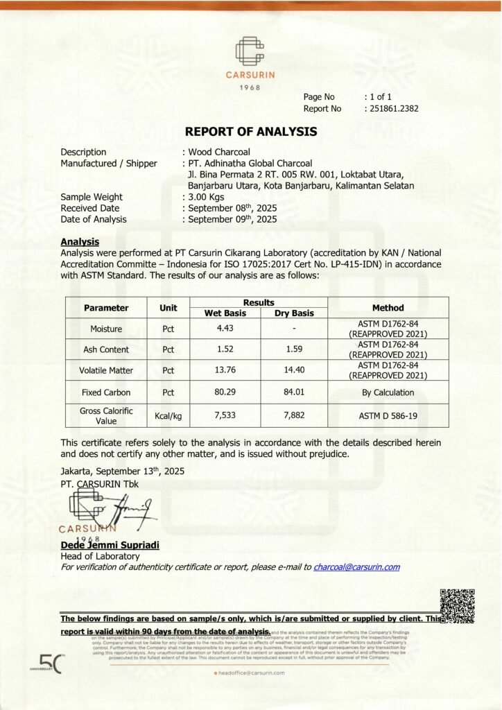Specification: – Raw material : halaban hardwood – Size: 5cm up – Ash content: below 1.2% – Total moisture: 4.8% – Fixed carbon: 60% – Volatile matter: 33% – Total sulphur: 0.02% – Gross calorific value: 6,800 kcal/kg – Duration of burning: around 2 hours